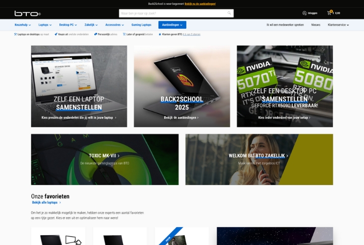 Zelf een laptop of desktop samenstellen, dat doe je bij BTO. Inmiddels al meer dan 24 jaar geleden startte BTO met het leveren van laptops op maat binnen Nederland en België. Doordat je exact de laptop kunt kiezen die past bij jouw doelen haal je er het maximale uit. Of jouw doel nu gamen, videobewerking of iets anders is, bij BTO ben je aan het juiste adres.